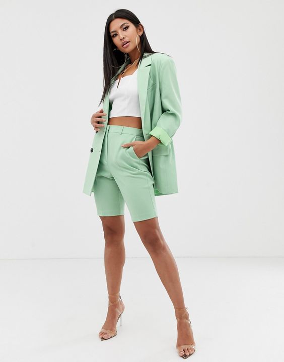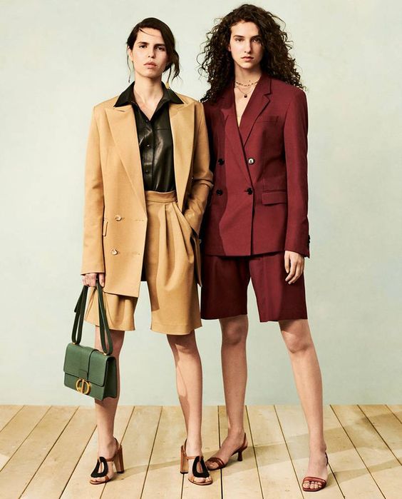 Тренд последних сезонов – брючный костюм с пиджаком оверсайз и шортами или велосипедками. Особенно выгодно этот наряд подчеркнет стройные ноги.