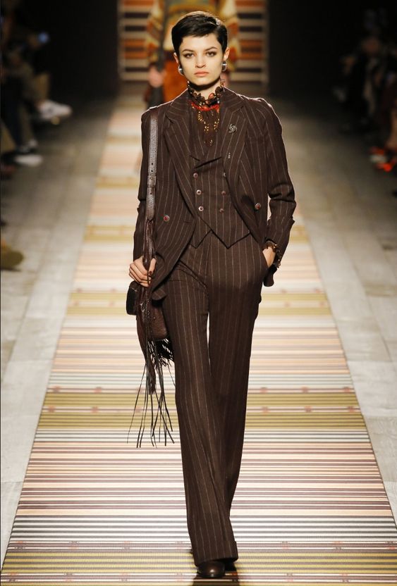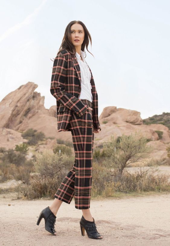 Главной тенденцией этого сезона являются брюки-палаццо, которые вернулись к нам из 1960-х. Костюм с такими брюками будет выглядеть эффектно как с элегантными лодочками, так и с грубыми ботинками.