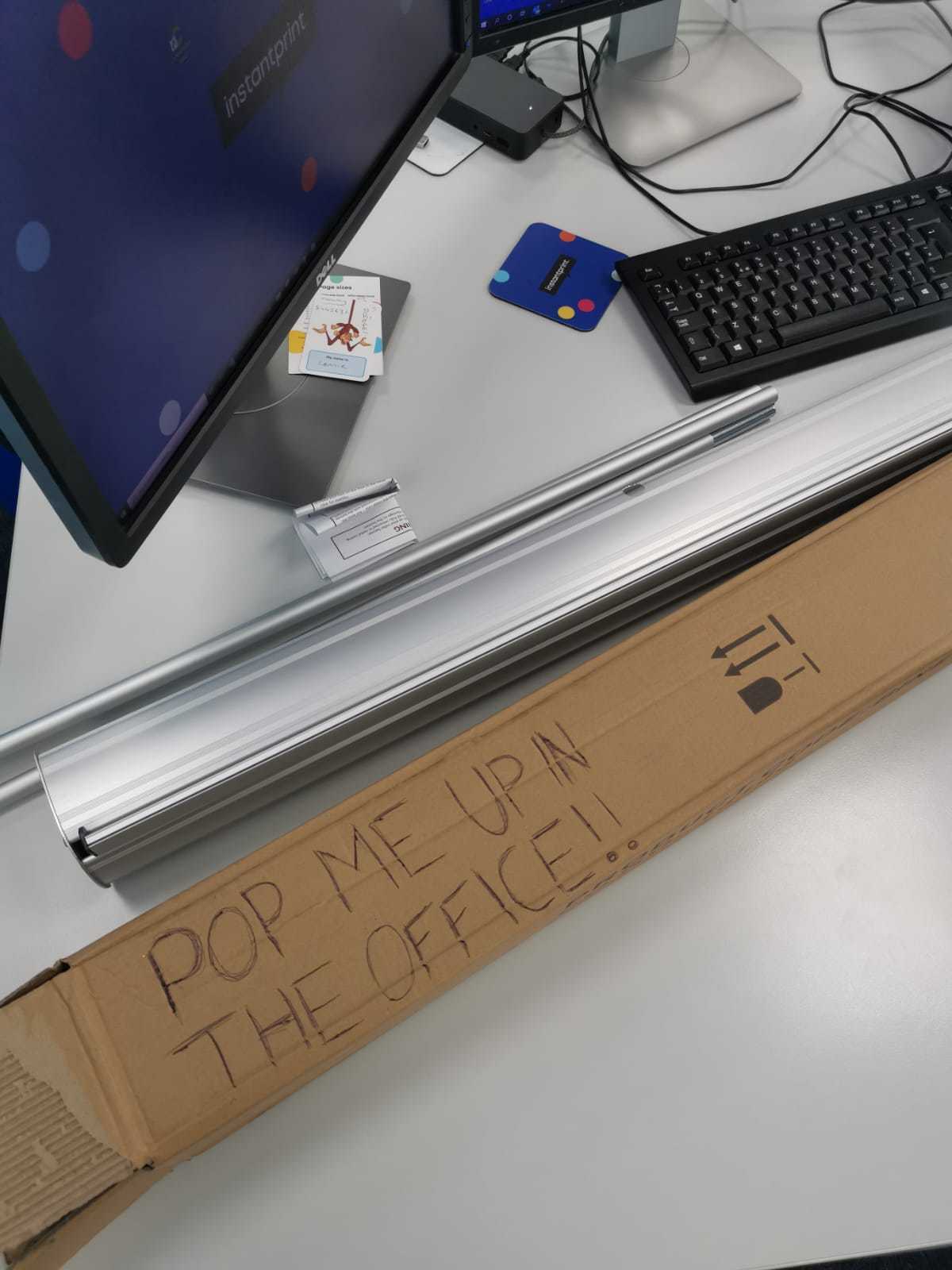 Баннер девушка поместила в картонную коробку в надписью: "Вытащите меня в офис!".