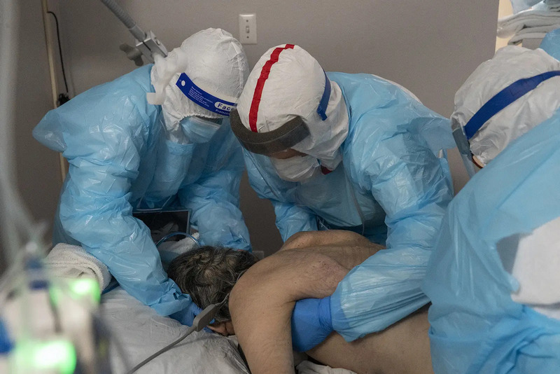 Медработники переворачивают пациента в положении лежа, 7 декабря 2020