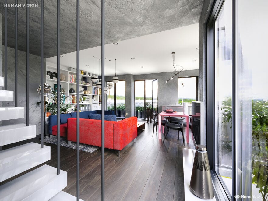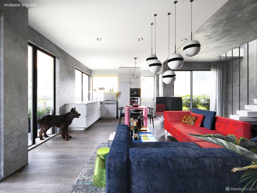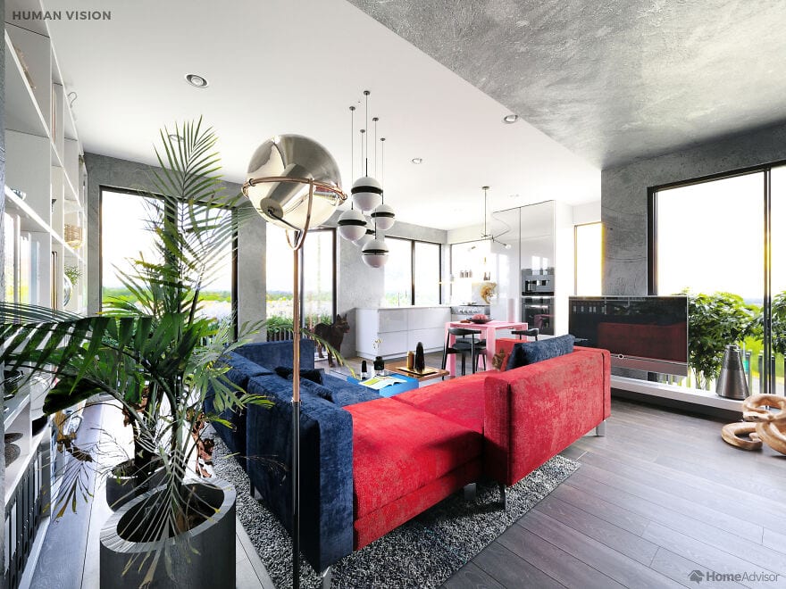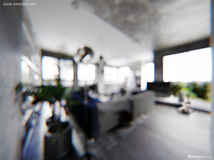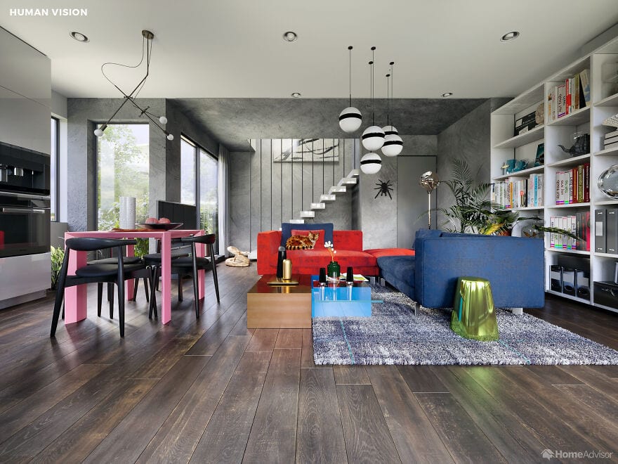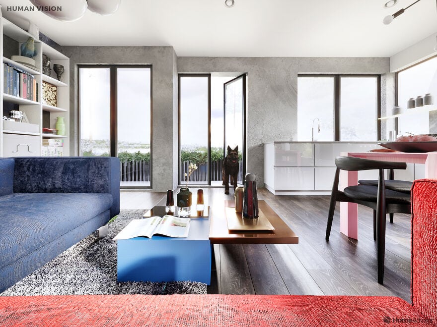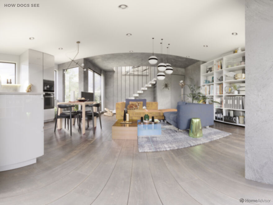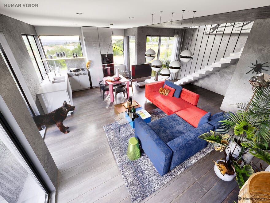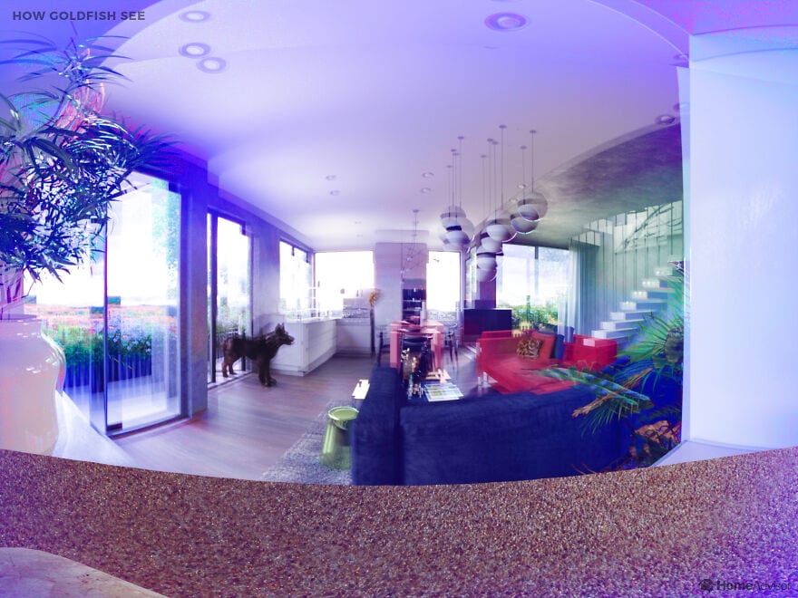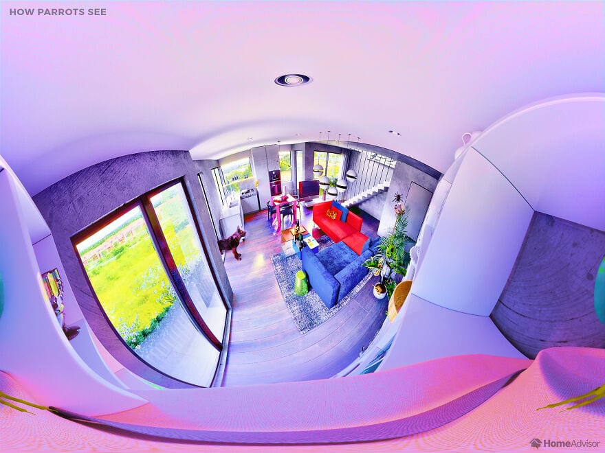 На сравнительных снимках показано, как одно и то же помещение видит человек и его любимец. Например, собаки видят очень мало цветов - для них все комнаты выполнены в пастельных тонах, а мир глазами попугая такой же яркий как и он сам. Больше всего жалко пауков - они видят так, что хочется предложить им очки.