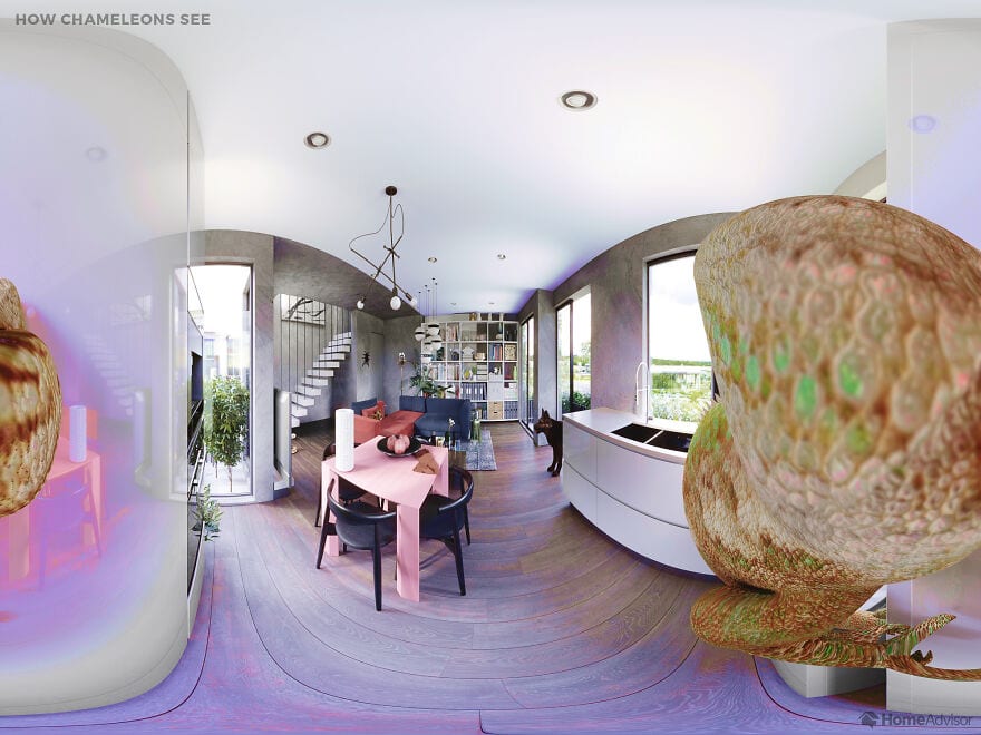Вы когда-нибудь задумывались, как животные видят мир вокруг себя? Ответить на этот вопрос решила компания Home Advisor, создав любопытный проект. Он представляет собой виртуальную комнату, вокруг которой размещены 7 домашних питомцев: собака, кот, попугай, змея, паук, хамелеон и аквариумная рыбка.
