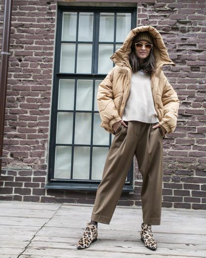Также вы можете надеть широкие брюки со стрелками, свитер и короткий дутик, а дополнить образ ярким акцентом - полусапожками с леопардовым принтом.