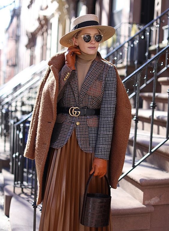 Если вы хотите собрать лук в стиле смарт-casual, наденьте кожаную юбку плиссе, однотонную водолазку и пиджак в клетку. Дополните образ пальто или шубой из искусственного меха, небольшой сумкой, шляпой и кожаными перчатками.