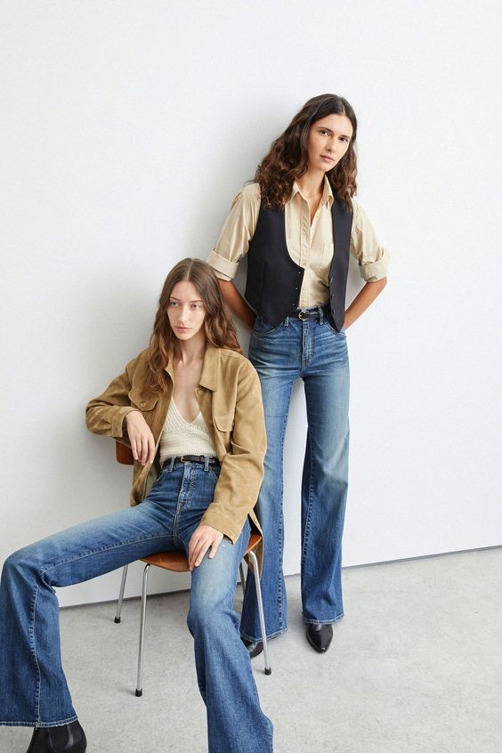 Если у вас в офисе нет строгого дресс-кода, можно подобрать лук в стиле сasual с расклешенными джинсами, рубашкой и жилетом или пиджаком оверсайз.