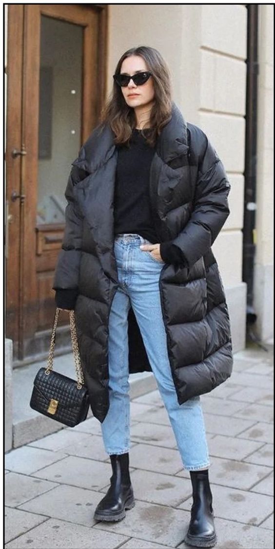 Если вы поклонница уличного стиля – надевайте любимые синие джинсы, свитер и пуховик ниже колена. Дополнят образ грубые ботинки и сумка-клатч на цепочке.