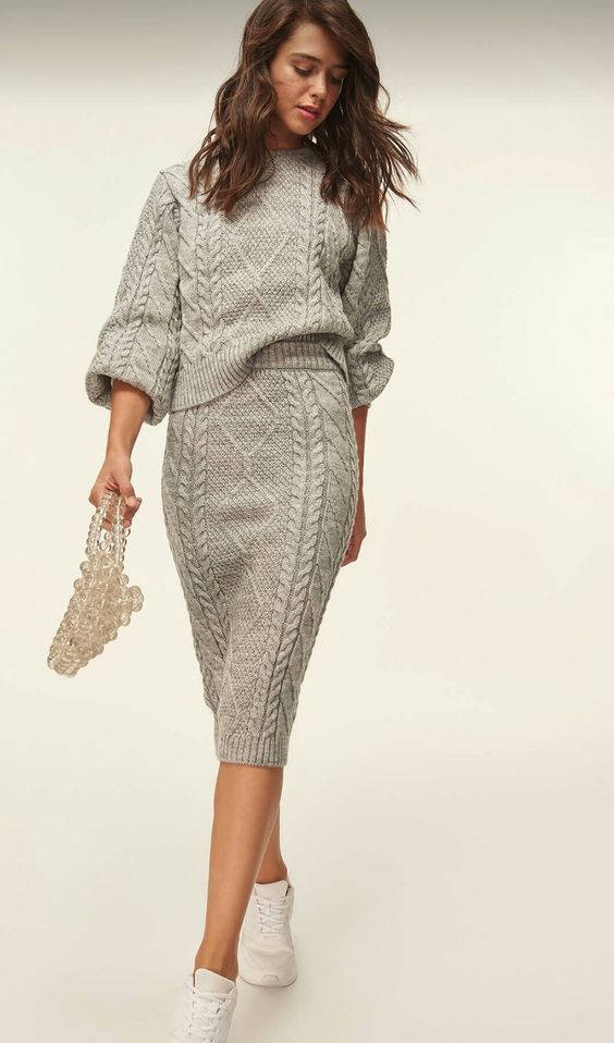Для зимней прогулки в парке или похода в гости также подойдет вязаный костюм в стиле сasual. Вы можете носить такой комплект как с утепленными кроссовками, так и с ботинками на удобном каблуке, а сверху надеть длинный пуховик или дутую куртку.
