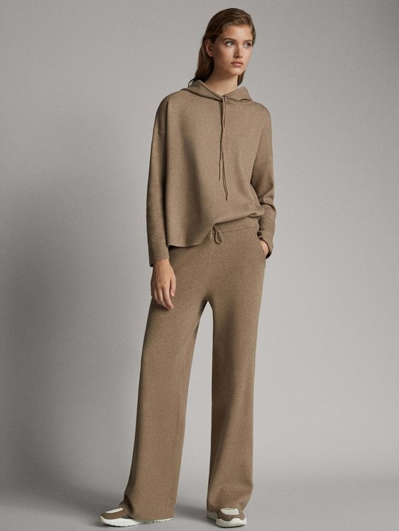 Еще один вариант стиля сasual – спортивный. Вы можете выбрать трикотажный брючный костюм бежевого цвета и дополнить его коротким пуховиком и утепленными кроссовками.