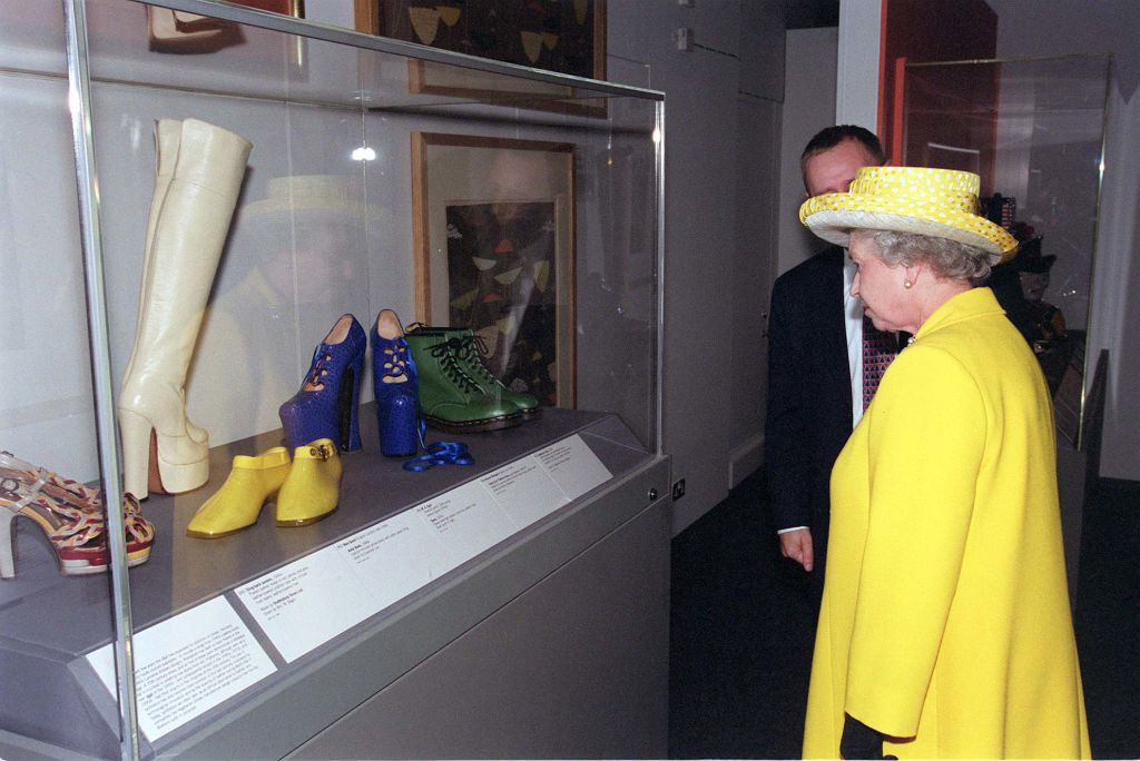 Королева Елизавета на выставке в Лондоне смотрит на синие туфли от Вивьен Вествуд, в которых Наоми Кэмпбелл упала на подиуме.
