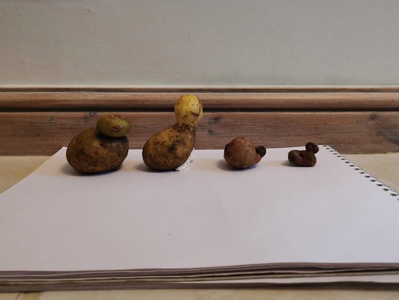 "С началом карантина мы начали выращивать много собственных овощей, от моркови и салата до бок-чой и картошки, - рассказал Тим. - Но я определенно не был готов к тому, что мы вытащим из земли семейство картофеля в форме утки. Со стороны казалось, что все, кого я вытащил, были одинаково сложены".