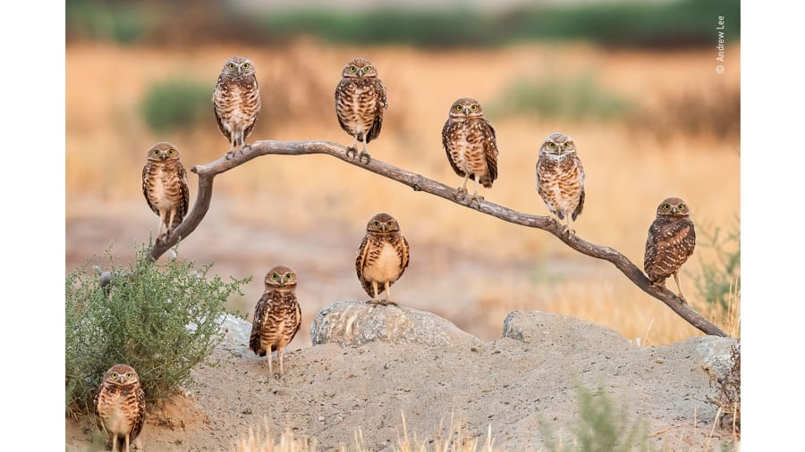 Семейство кроличьих сов собралось вместе для общего портрета. После многих дней ожидания фотограф сумел наконец заставить маму, папу и 8 птенцов на секунду посмотреть в его сторону широко распахнутыми глазами.