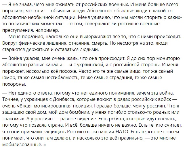 "Якобы канадская режиссерка с типичным канадским именем Анна Трофимова показала (а жюри отобрало эту ленту!!!) типично российский пропагандистский фильм Russians at war о "человечности российских солдат", "обеих сторон войны", "правду сквозь туман войны" и прочие уже хорошо известные пропагандистские мемы, нарративы из области "все неоднозначно". Фильм показан на фестивале, когда Украина буквально тонет в крови своих детей. Все опять в духе европейской толерантности, на которой так любил все эти десятилетия и продолжает спешно паразитировать русский мир. Режиссерка заявила, что она и ее собеседники не заметили никаких следов военных преступлений российских солдат в Украине", - написала Марголис.