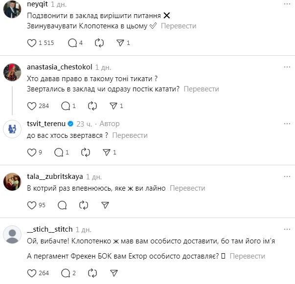 "Клопотенко, спасибо, что накормил (сарказм!!!) Заказал украинскую кухню в "Муза" от Клопотенко и понюхал фигу, потому что ничего не приехало! Ты хоть смотришь, кто и где твое имя использует?" – возмущенно обратился Терен к Клопотенко.