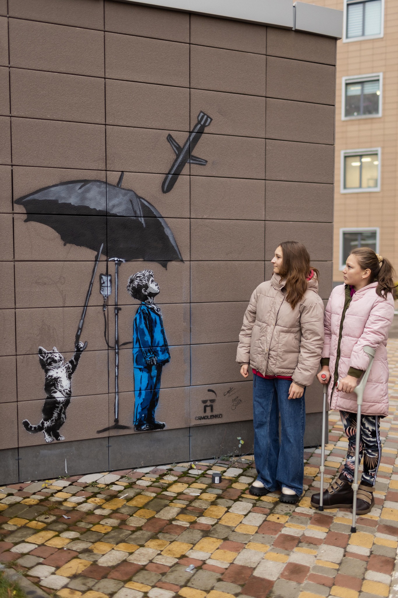На стене детской больницы Охматдет появился новый мурал-граффити – символ защиты детей во время войны. На изображении мальчик стоит с капельницей, а рядом кот с зонтиком, который будто прикрывает его от летящей ракеты.