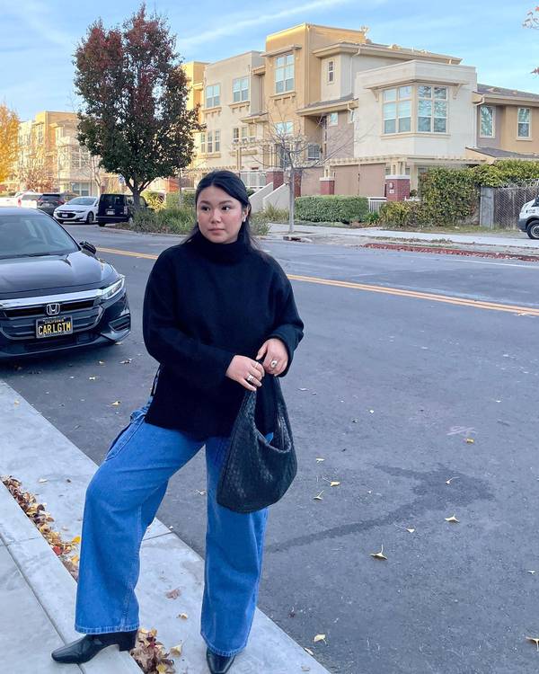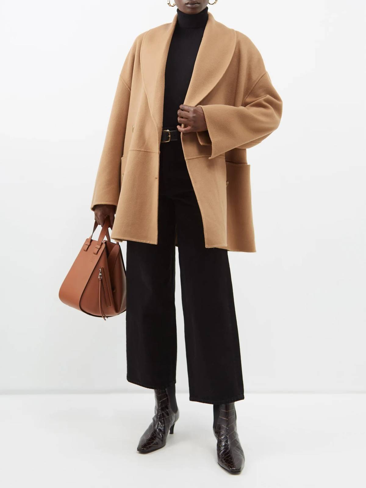 Если вы любите нестандартные образы, присмотрите укороченные широкие джинсы из черного денима с высокой посадкой. Надевайте черный гольф-водолазку и короткое пальто с широким воротом в оттенке кемэл. Дополните лук ботильонами из кожи питона и классической сумкой.