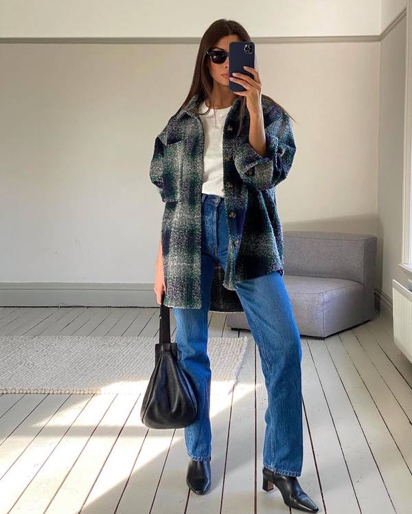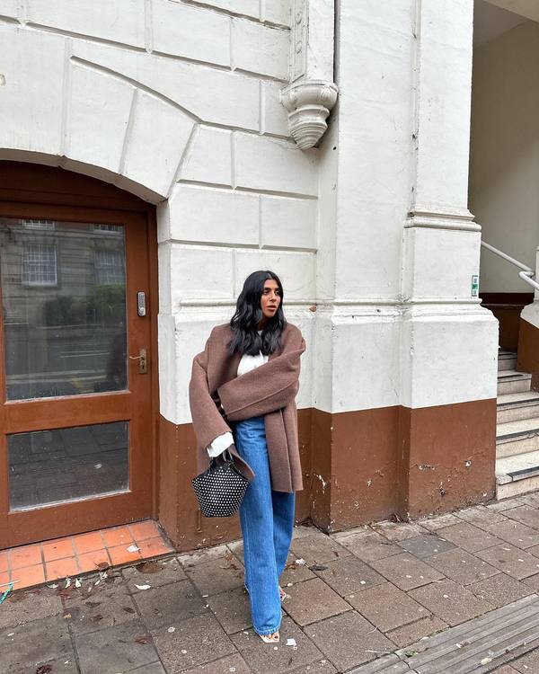 Для повседневных луков присмотрите широкие джинсы классического голубого цвета. Надевайте их с белой футболкой или лонгсливом, а сверху накиньте пальто оверсайз.