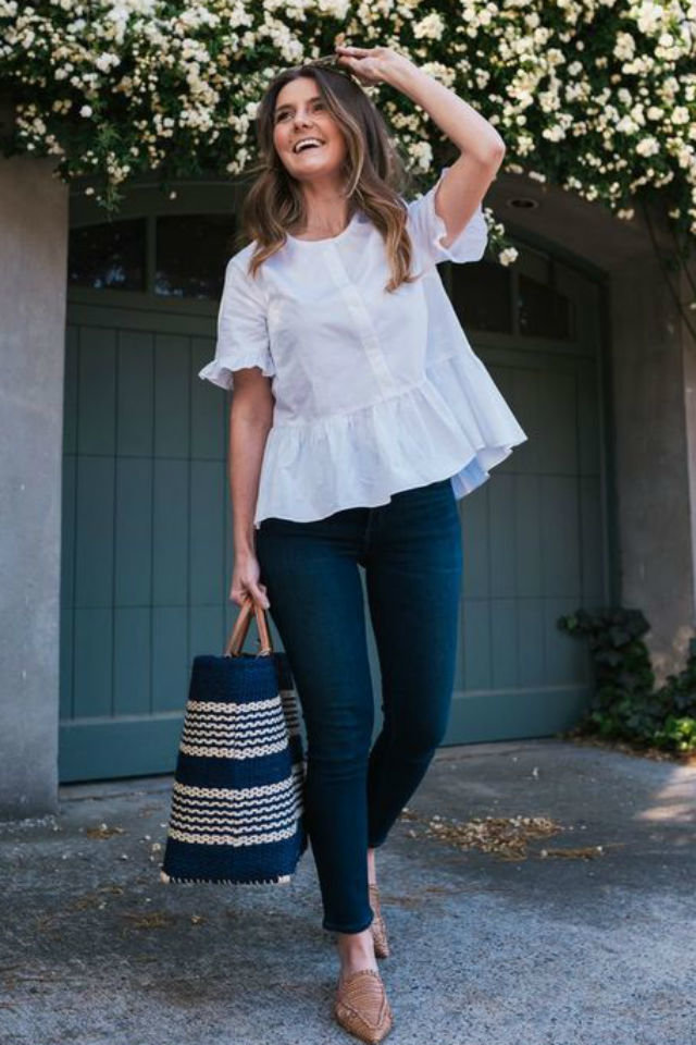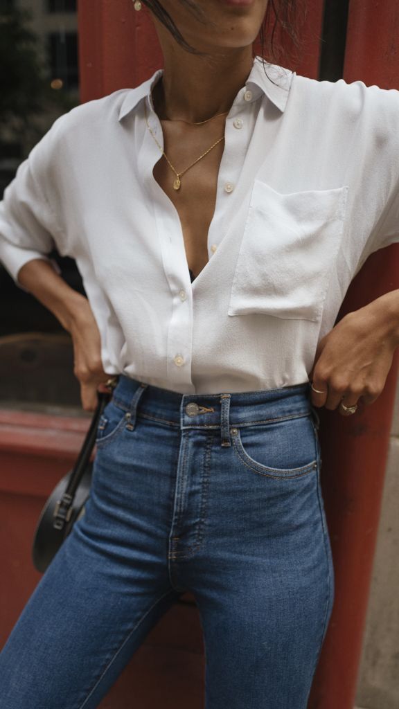 В первую очередь стоит сказать о самом популярном образе - джинсы в сочетании с белой блузой. Такой наряд уже давно начало считаться вариантом офисной классики, его пропускают даже многие корпоративные дресскоды. Также подобный лук прекрасно подходит для прогулки или свидания.