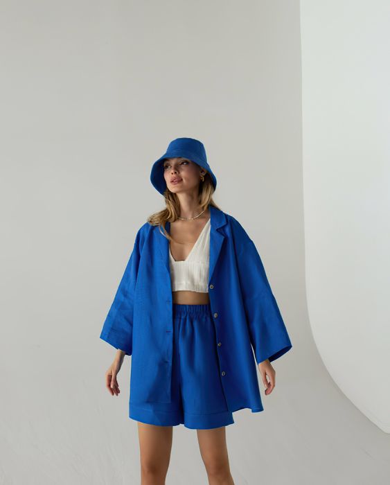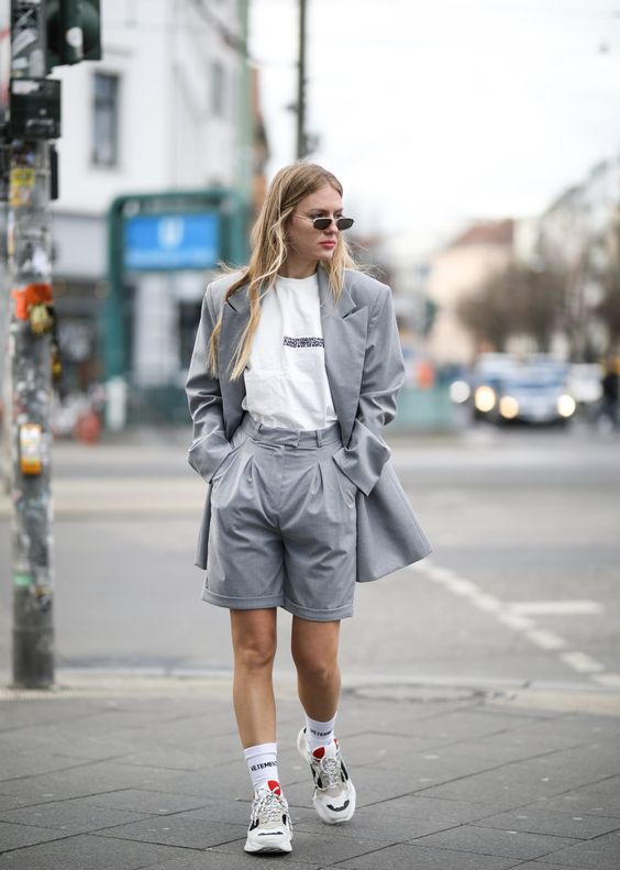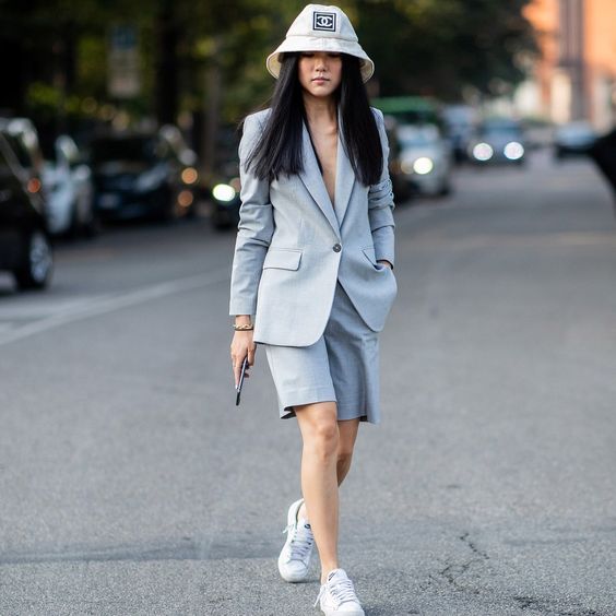 Еще один стильный вариант – льняной костюм с шортами и пиджаком оверсайз. Если вы не любите яркие оттенки, обратите внимание на серый. Дополните такой наряд кедами или кроссовками, а также панамой и сумкой-бананкой.