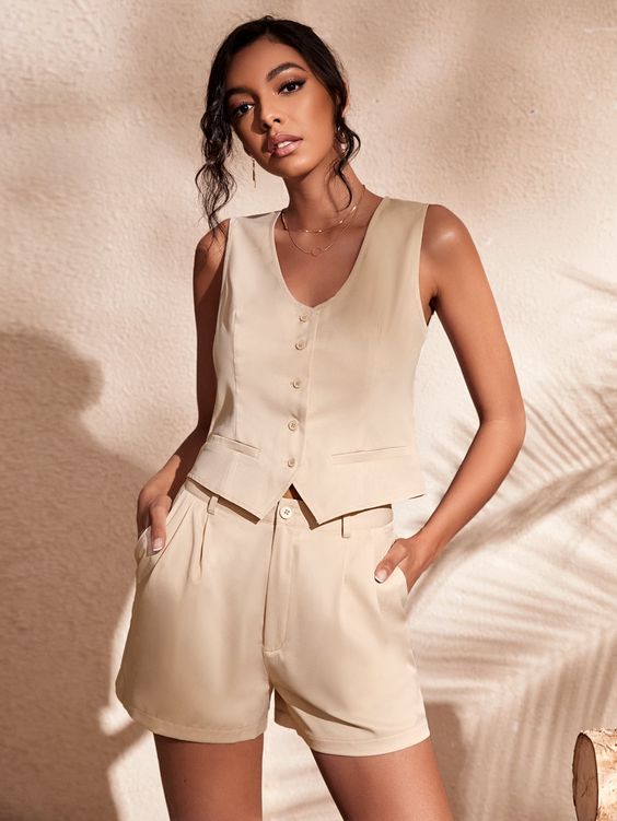 Также в летнем гардеробе каждой модницы должен быть летний костюм с жилетом. Сочетать его можно как с короткими шортами и шлепанцами на низком ходу в жаркие дни, так и с брюками и закрытой обувью в более холодные.
