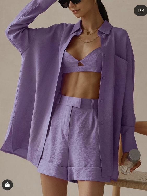Еще один вариант на лето – женский костюм, состоящий из рубашки свободного кроя и шортов. Выбирайте такой наряд из льна или муслина, чтобы чувствовать себя комфортно даже в самые жаркие дни. Под рубашку можно надеть топ или майку как такого же оттенка, как и костюм, так и контрастного цвета. Дополните лук панамой, удобными шлепанцами на низком ходу и пляжной сумкой.