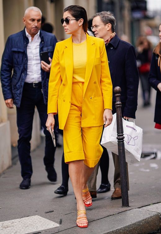 Для повседневного офисного лука, если, конечно, у вас нет строгого дресс-кода, присмотрите летний костюм яркого цвета: нежного лилового, желтого или кораллового. Выбирайте шорты с высокой посадкой и подворотами, а также пиджак классического кроя. Дополните образ белой футболкой или майкой, а также бежевыми туфлями на высоких каблуках и небольшой сумкой в тон к обуви.