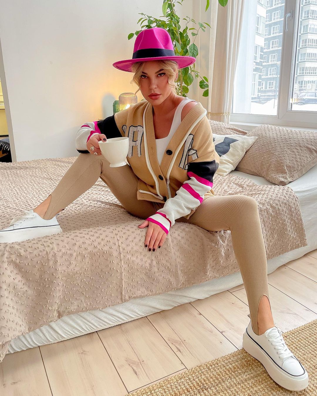 А для расслабленного лука выходного дня присмотрите бежевые леггинсы со штрипками. Носить их можно с белой майкой и стильным кардиганом. Дополнят образ удобные кеды, небольшая сумка-шопер и шляпа с широкими полями.