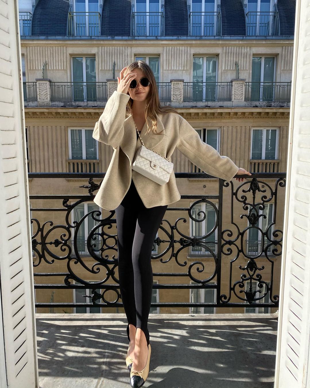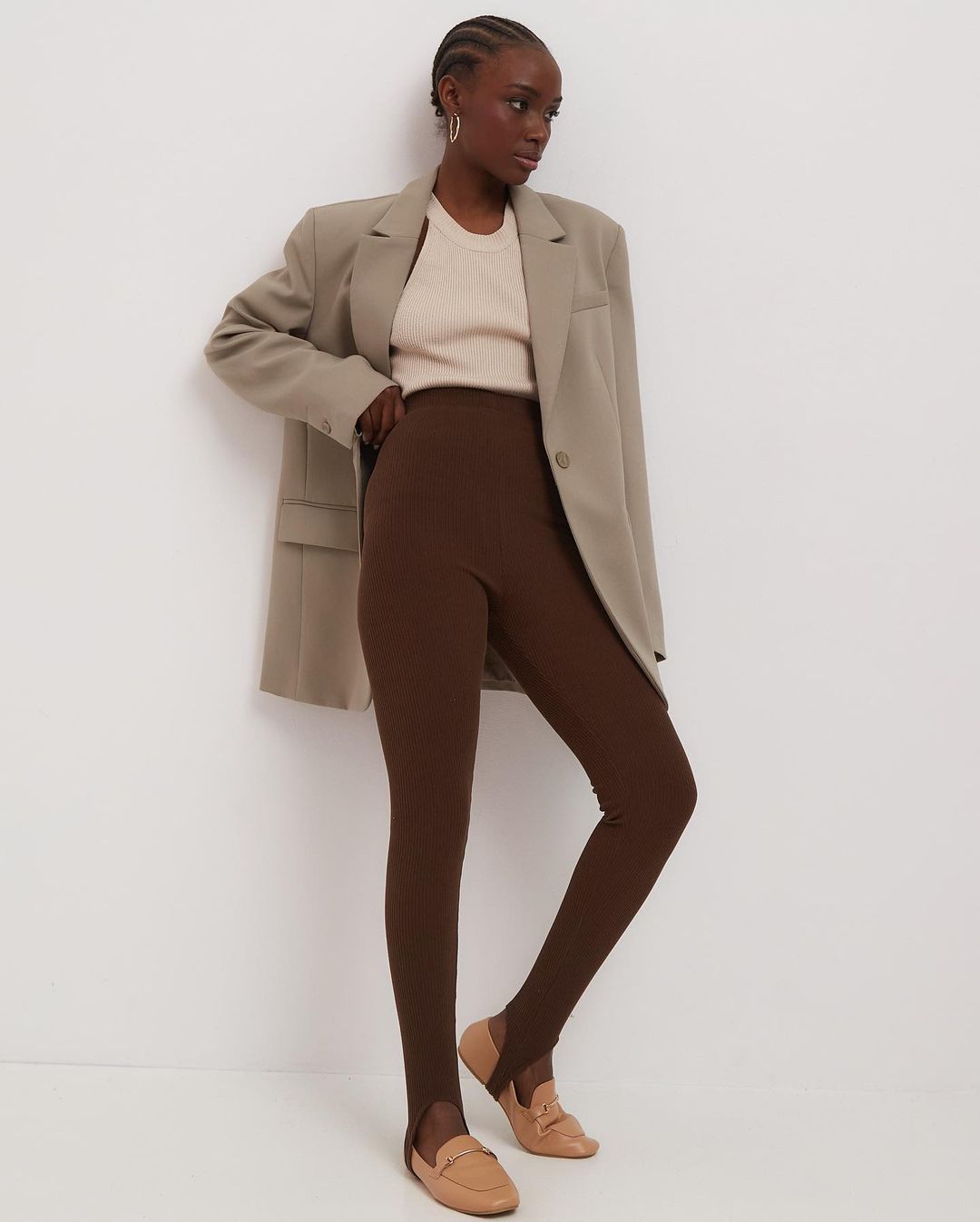 Леггинсы со штрипками можно как заправлять в обувь, так и надевать поверх нее. Для офисного лука, если, конечно, у вас нет строгого дресс-кода, подойдут коричневые леггинсы, бежевый топ в рубчик и пиджак в стиле оверсайз. Дополните образ бежевыми мокасинами и небольшой сумкой.