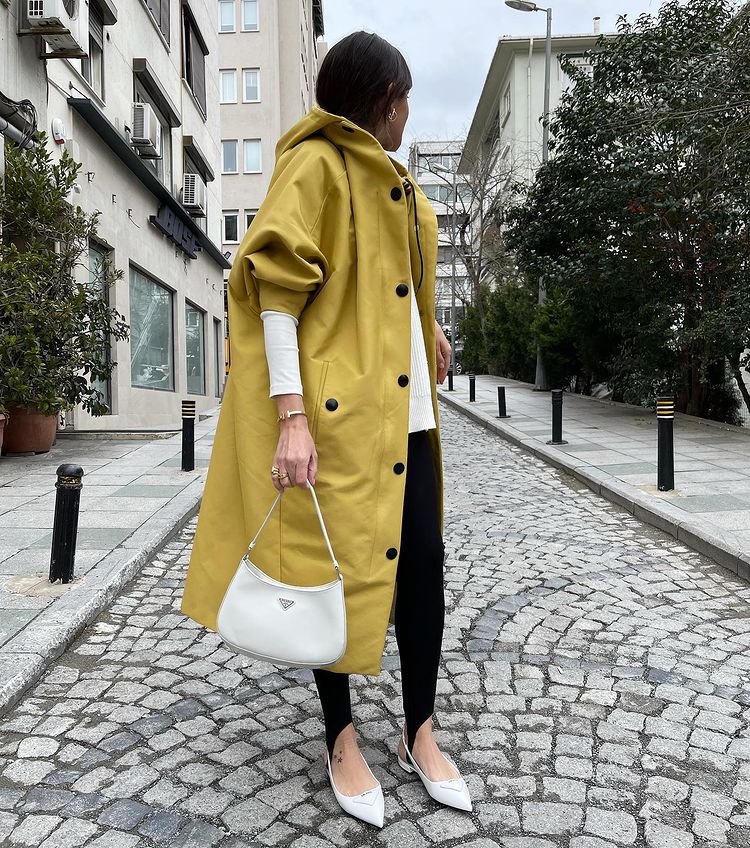 Еще один вариант – надевайте такие леггинсы с белой водолазкой или объемным свитером и длинным плащом яркого цвета, например, желтого. Дополните стильный лук маленькой сумочкой и обувью на низком ходу светлого оттенка.