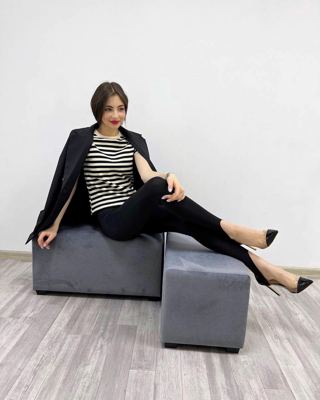 Еще один вариант – как в офис, так и на свидание – надевайте футболку-тельняшку, черные леггинсы со штрипками и полупрозрачные туфли-лодочки. Свой лук дополните стильной сумкой контрастного цвета.