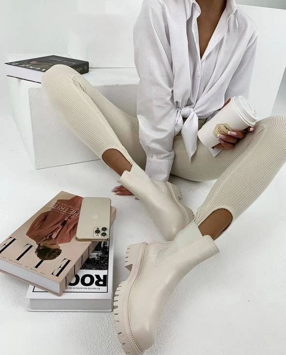 Еще один вариант, с чем их можно сочетать, - с белой рубашкой. Подберите модель леггинсов в рубчик, а сверху надевайте топ и блузу, которую можно оригинально завязать узлом. Дополните образ ботинками-челси, небольшим клатчем и курткой-косухой.