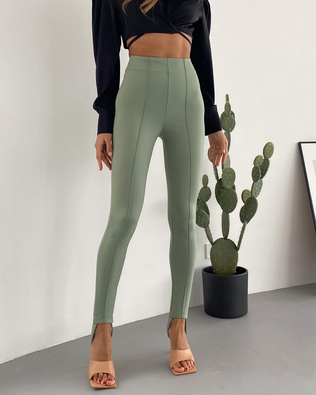 Еще один вариант на теплую весну или лето – леггинсы со штрипками и стрелками. Надевайте под модель оливкового цвета укороченную черную блузу с длинными завязками и рукавами. Дополните лук открытыми босоножками и небольшим клатчем.