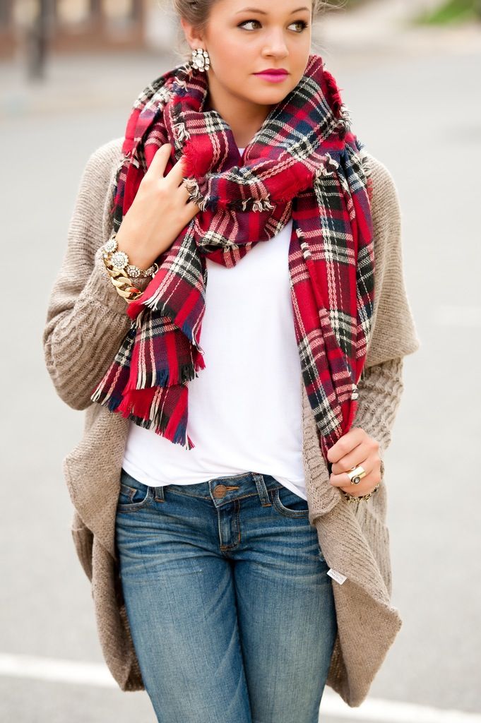 С красными клетчатыми шарфами прекрасно сочетаются белые и светло-кофейные вещи. Ну а если добавить в образ немного аксессуаров, лук получится просто шикарным.