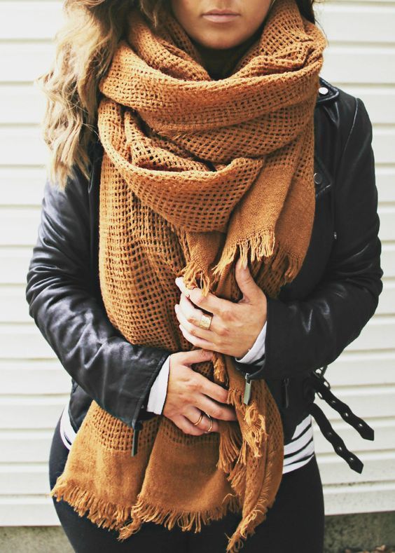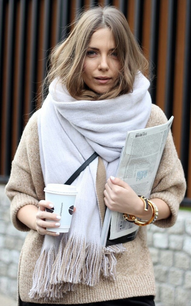 В тренде крупные плетения и ткань грубой вязки, такие шарфы хорошо подойдут под стиль кежуал. Разнообразить наряд можно очками и крупными сережками.