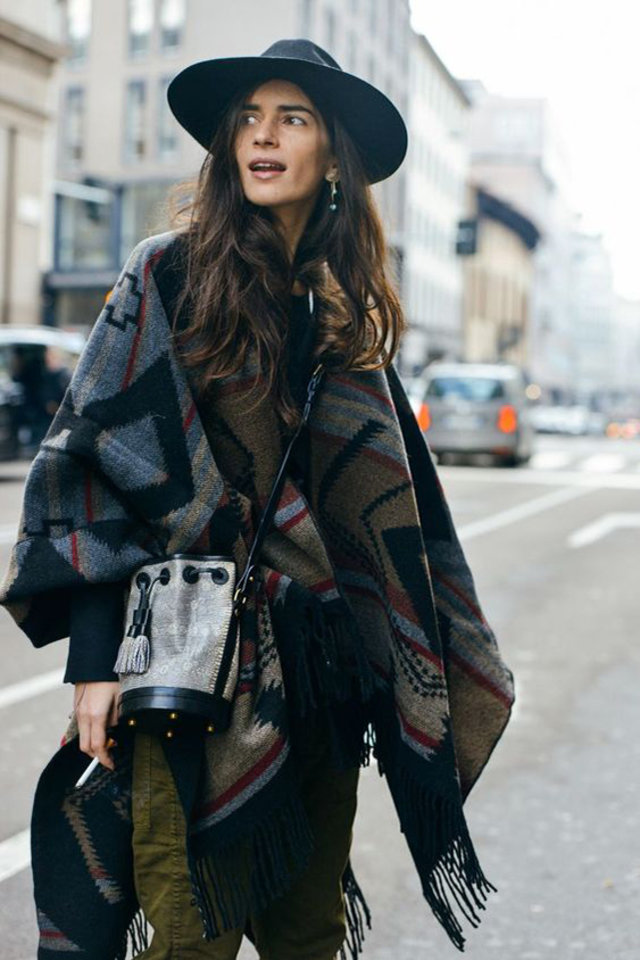 Большой шарф можно также носить как модную накидку. Стоит только добавить шляпу и серьги - и образ в популярном стиле бохо готов.