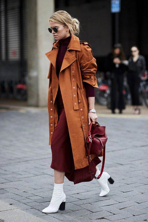 Коричневые, горчичные и кофейные пальто и тренчи хорошо смотрятся с модным оттенком марсала. Разбавить образ можно акцентами белого или молочного цветов.