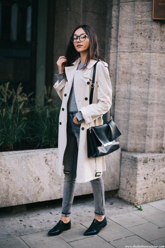 Нюдовые и бежевые плащи прекрасно смотрятся со стилем кежуал. Свитер, обувь на низком ходу, современные стильные джинсы и парочка аксессуаров - и образ на каждый день готов.