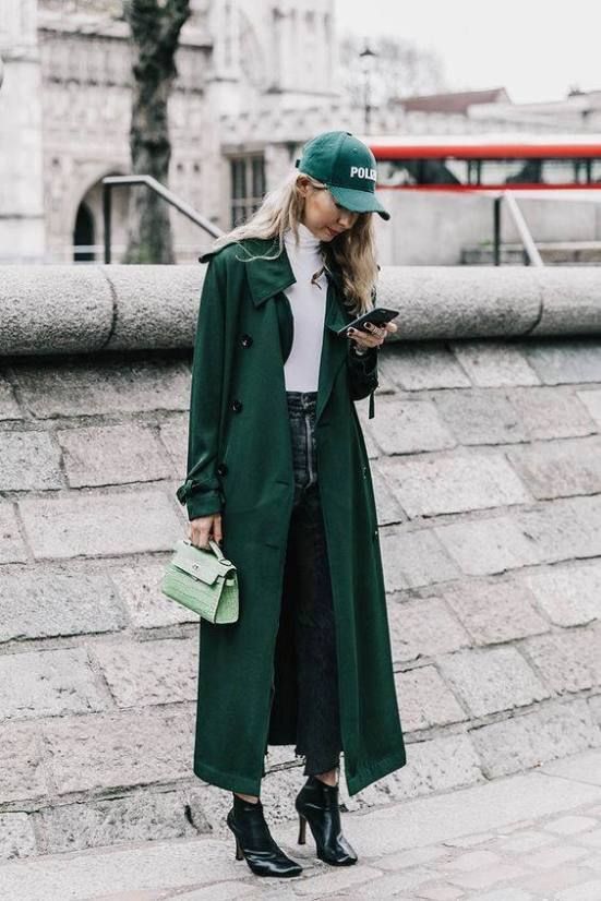 Еще один модный цвет - насыщенный "бутылочный" зеленый. Этот оттенок идеально гармонирует с белым, черным, алым цветами, а также с классическим синим денимом.