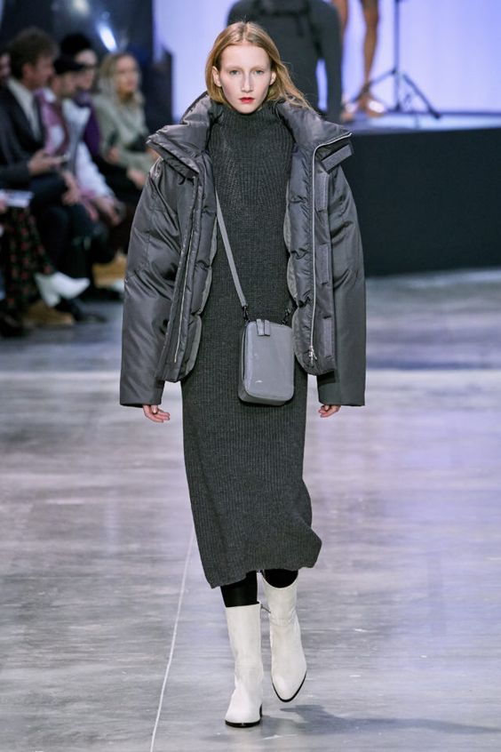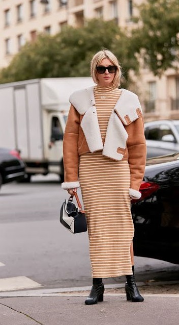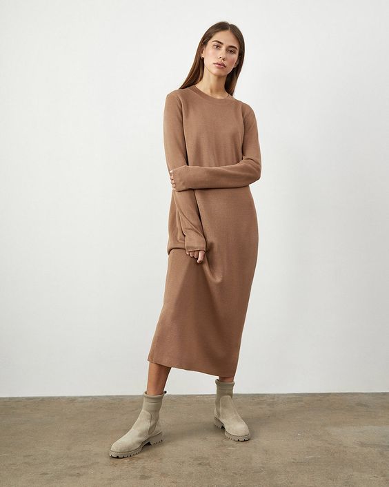 Еще один тренд сезона – грубые ботинки – отлично смотрятся с платьем миди прямого кроя. Дополнить образ можно как пуховиком, так и косухой или короткой дубленкой.