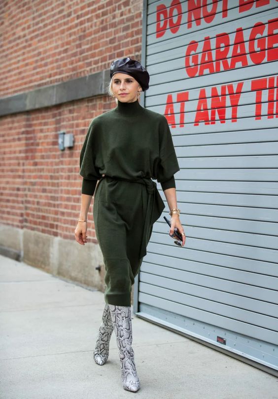 Для тех модниц, которые любят выделяться из серой массы, рекомендуем дополнить однотонное трикотажное платье стильным беретом из эко-кожи и сапогами с анималистичным принтом. Сверху можно накинуть лаконичное пальто.