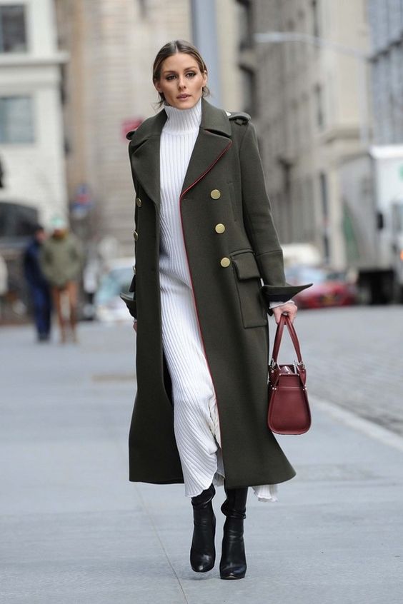 Для тех, кто предпочитает более строгий стиль, можно надеть платье миди, пальто и сапоги на высоком каблуке, а дополнить лук яркой сумкой.