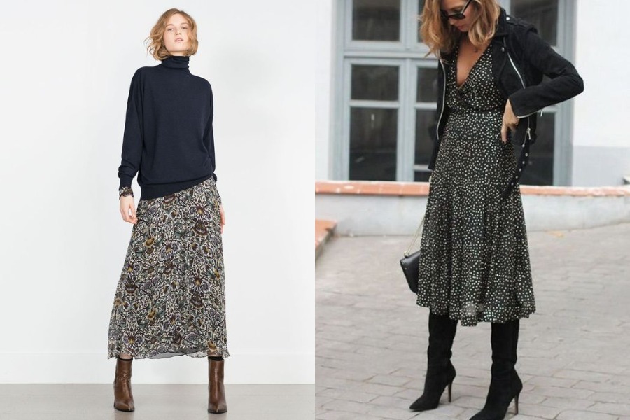 Если вы хотите надеть шифоновое платье миди зимой, можно стильно утеплиться с помощью вязаного свитера, а сверху накинуть кожаную куртку или короткую дубленку.