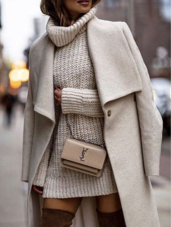 Второй вариант – вязаное платье-свитер белого или молочного оттенка. Такая вещь будет отлично смотреться с высокими сапогами-ботфортами из замши, длинным пальто и маленькой сумочкой-клатчем.