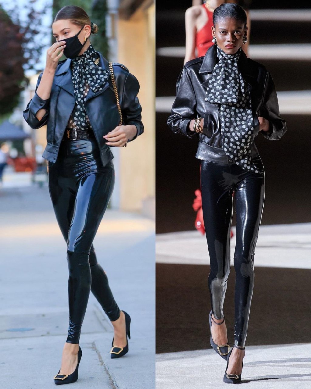 Лосины из латекса также станут модным дополнением гардероба этой весной. Их можно носить с короткими куртками-косухами, туфлями на каблуках и маленькими клатчами.
