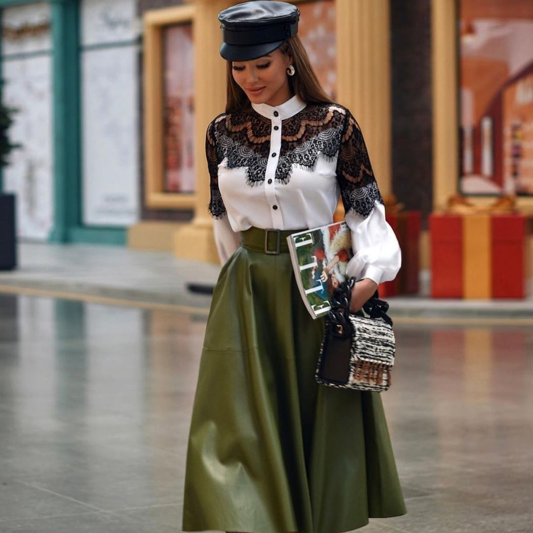 Для похода в офис можно надеть кожаную юбку-карандаш зеленого цвета и белую блузу с кружевом. К такому образу подбирайте неброские аксессуары и обувь.
