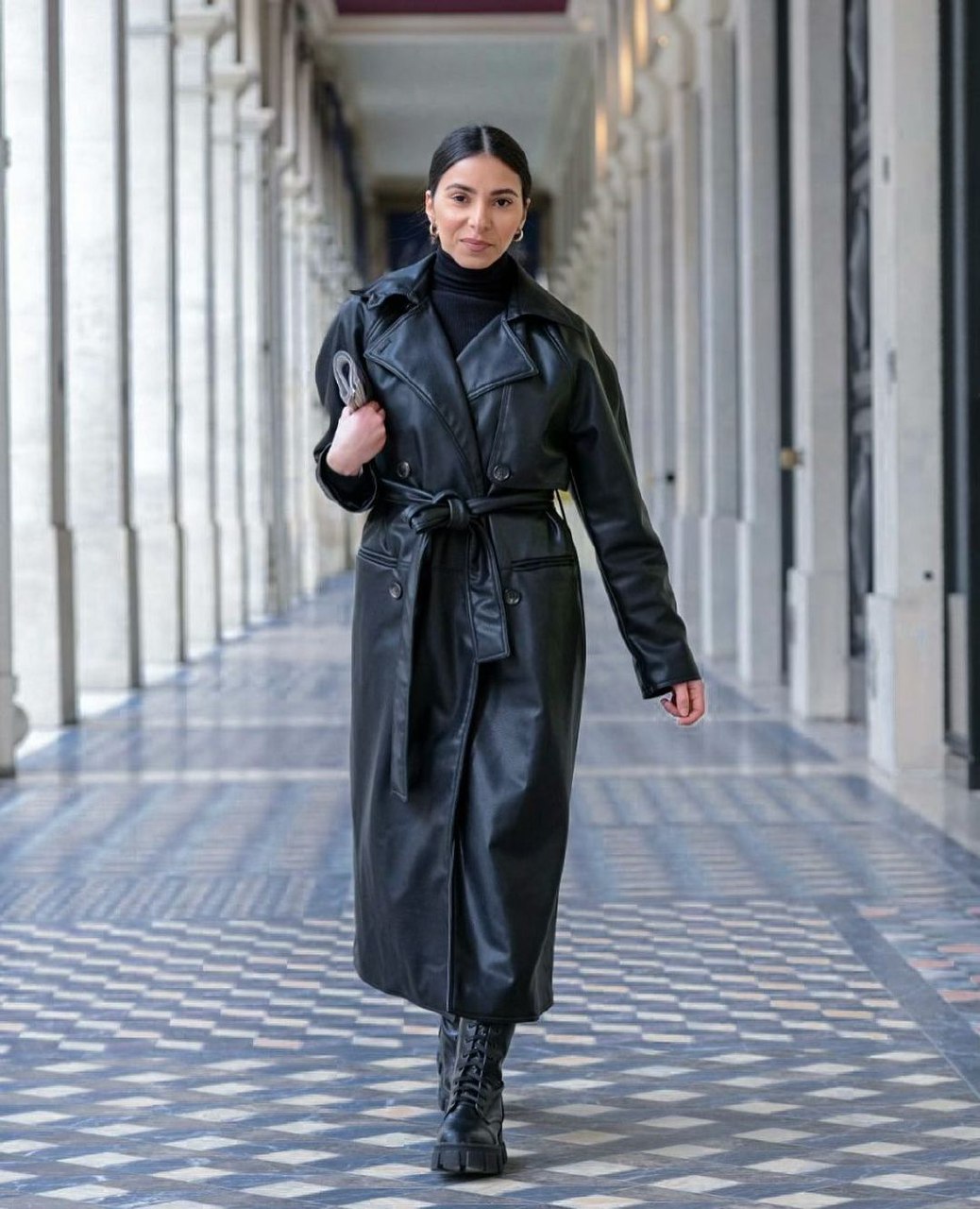 Еще одна трендовая вещь на весну – длинный кожаный плащ. С ним можно создать огромное количество стильных образов, но лучше всего его носить с грубыми ботинками на шнуровке.