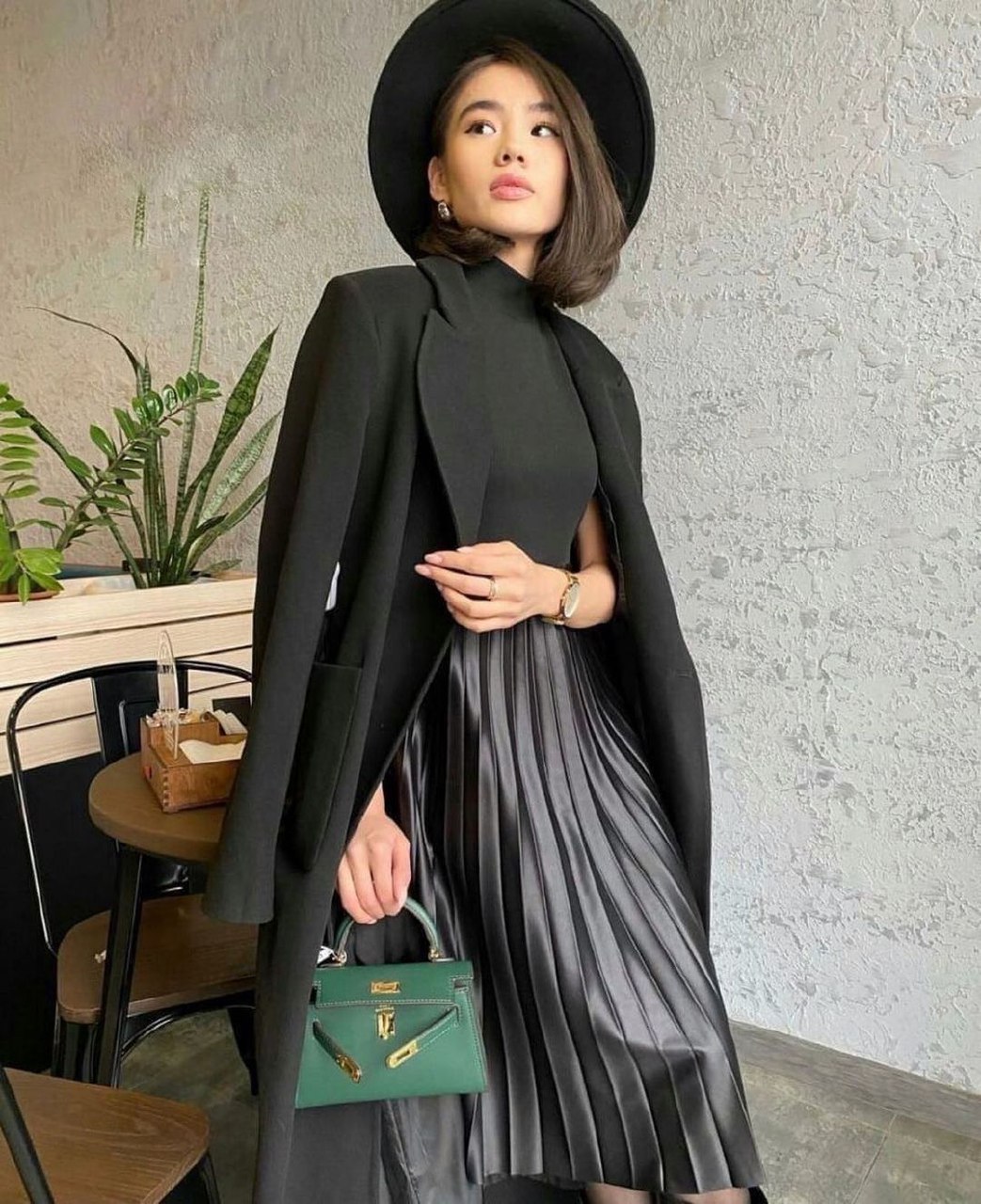 Для романтического свидания подойдет черное платье с кожаной юбкой плиссе. С ним можно надеть классическое пальто и элегантные сапоги на низком ходу. Дополнят образ аккуратная шляпа и сумочка-клатч.