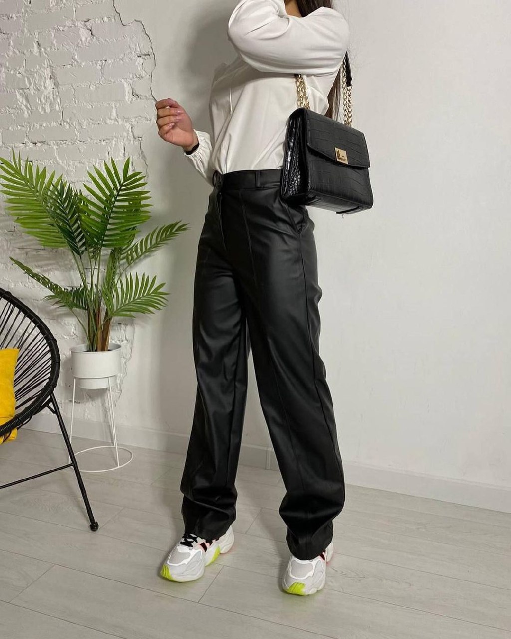 Также на весну можно присмотреть трендовые папины брюки из кожи и латекса. Носить их можно как с классической обувью и пиджаками, так и с кроссовками.