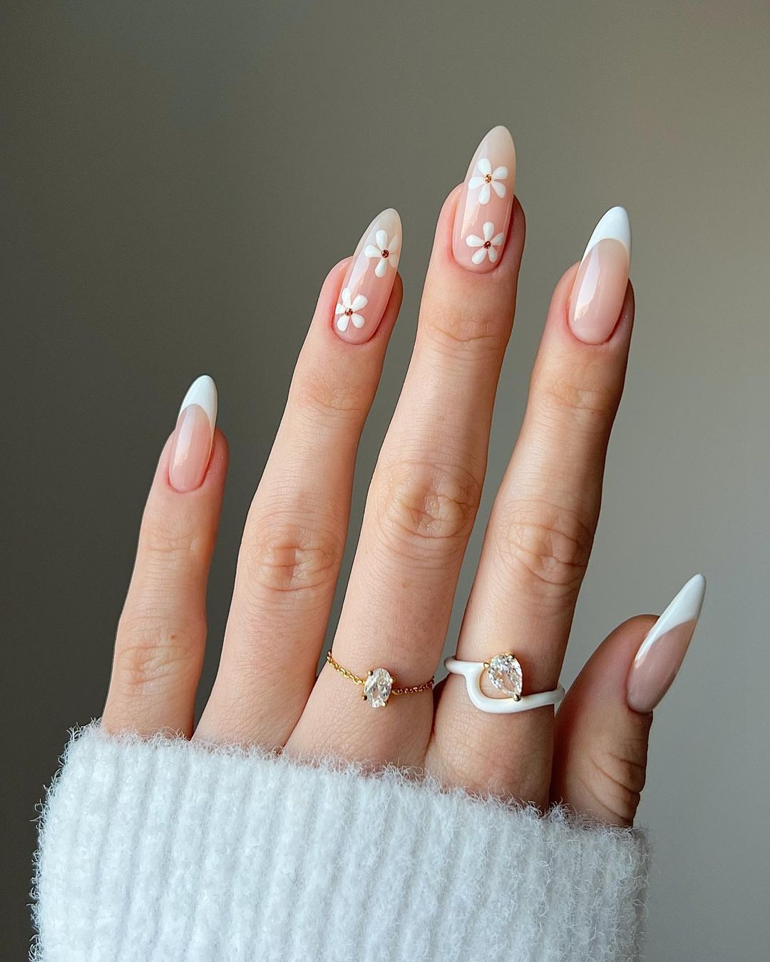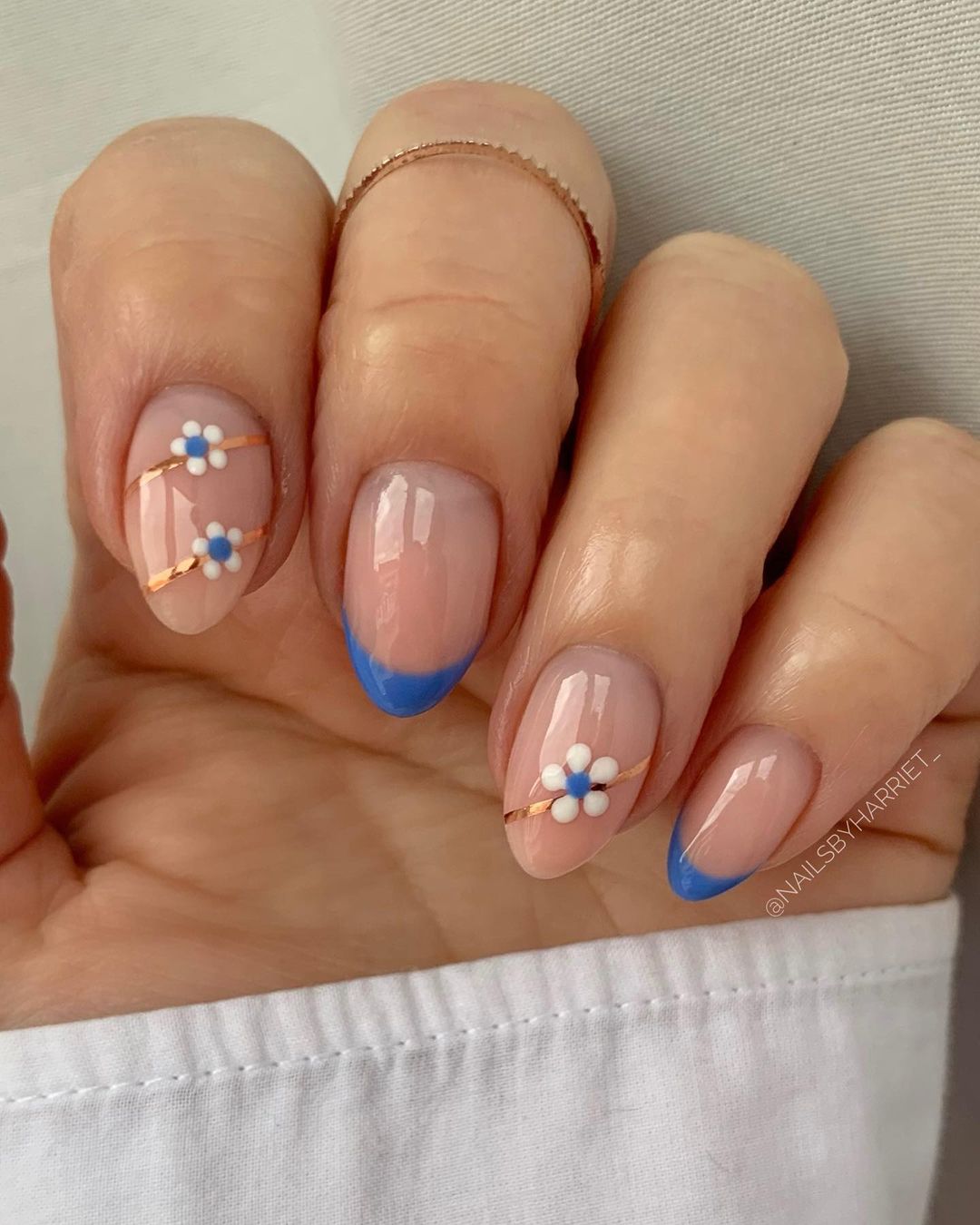 Если вы любите нестандартные идеи, выбирайте френч с синим кончиком, а несколько ногтей украсьте изображениями ромашек. Такой дизайн будет стильно смотреться как на коротких, так и на длинных ногтях.