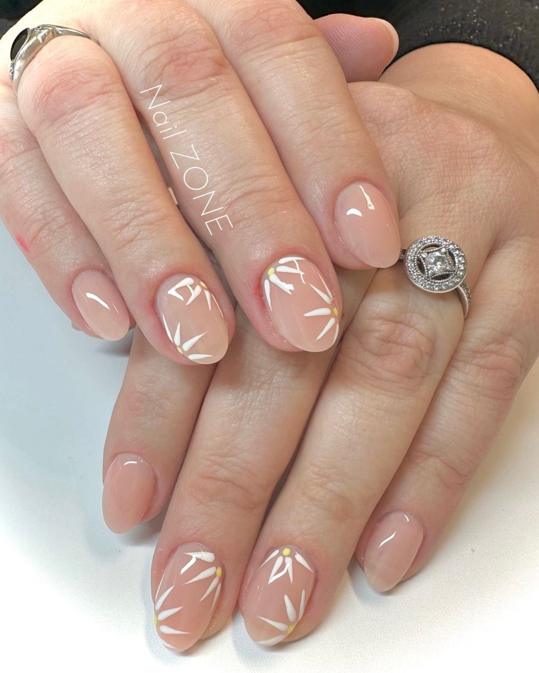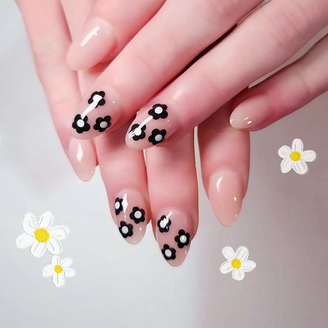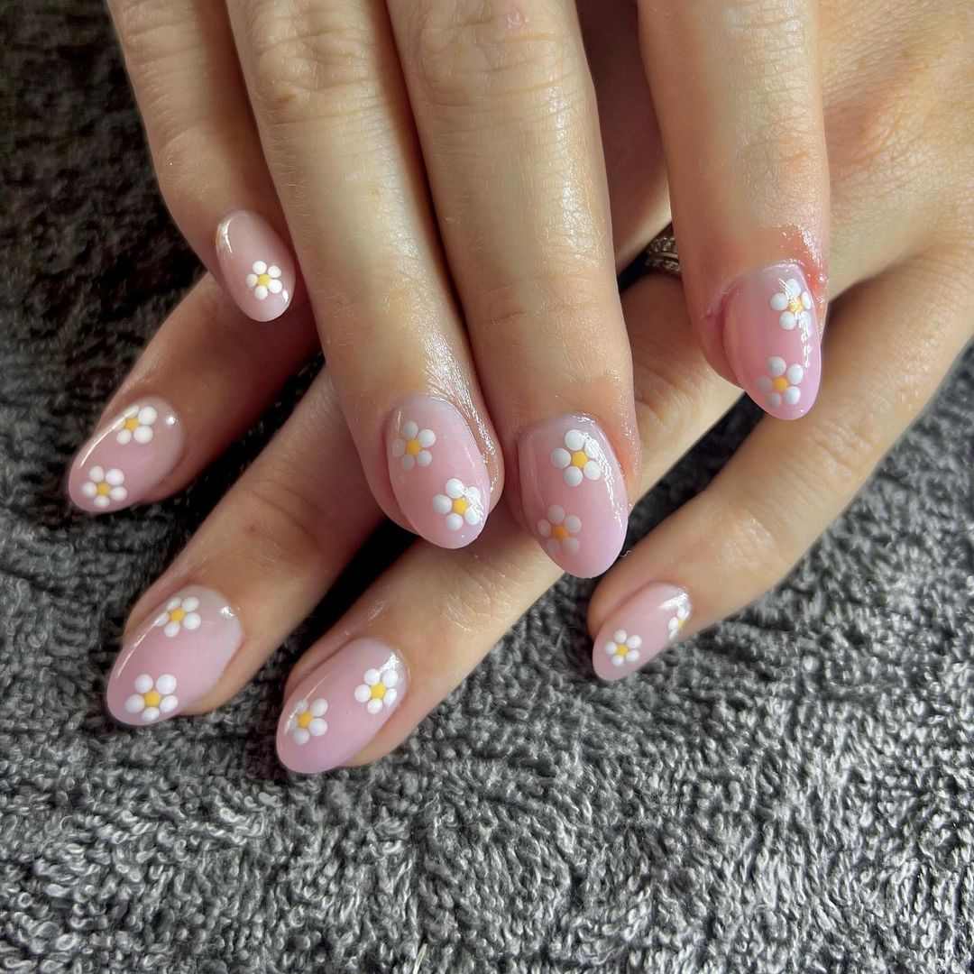 На коротких ногтях с однотонным полупрозрачным покрытием будут красиво смотреться небольшие ромашки. Они могут быть необычного цвета или разного размера.