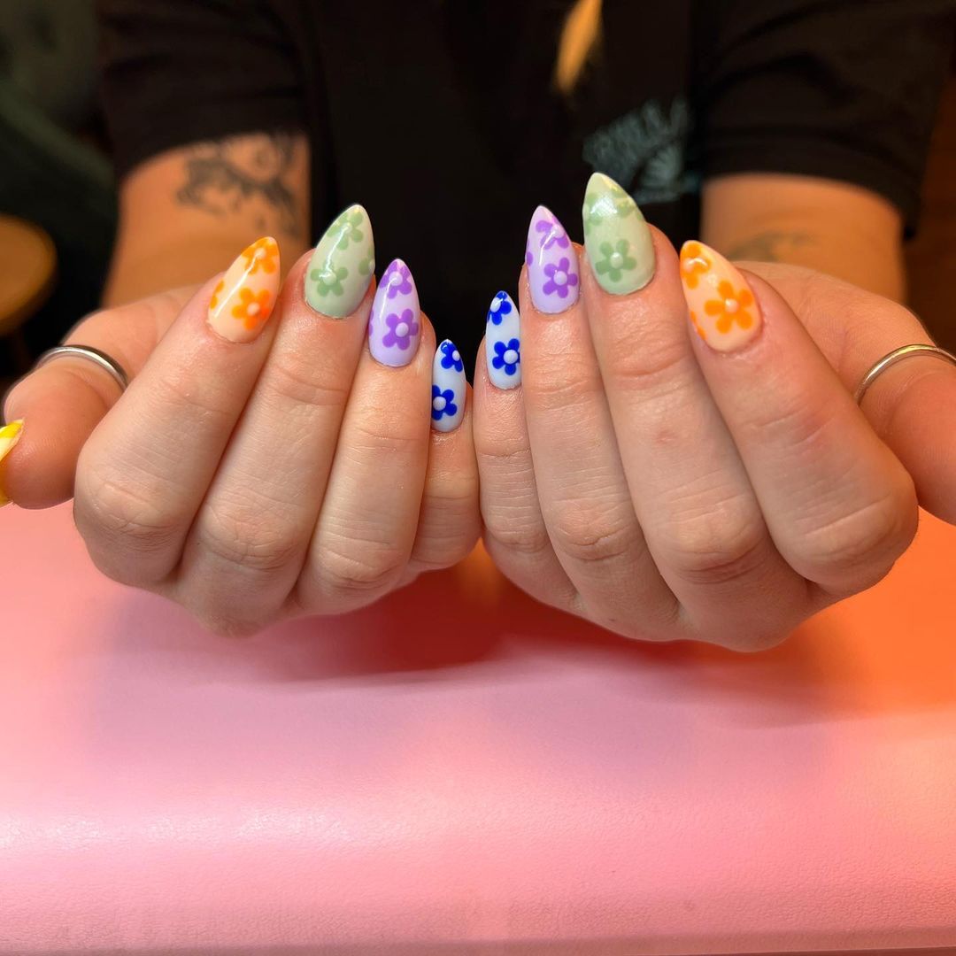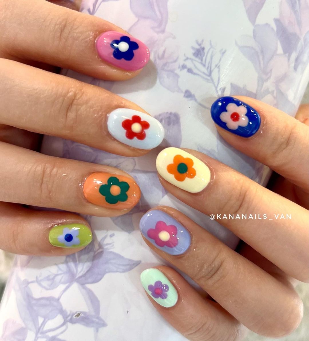 Чтобы выделяться из толпы, украсьте каждый ноготь другим цветом и ромашкой в тон или же контрастного цвета. Получится смелый весенний дизайн.